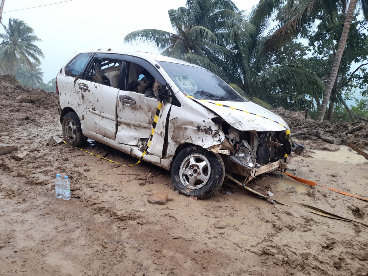“Hanya mobil rusak berat, tertimpa batu besar dan batang pohon dari atas gunung,” ungkap Juanedi sembari membenahi barang yang berada di dalam mobil naas tersebut.