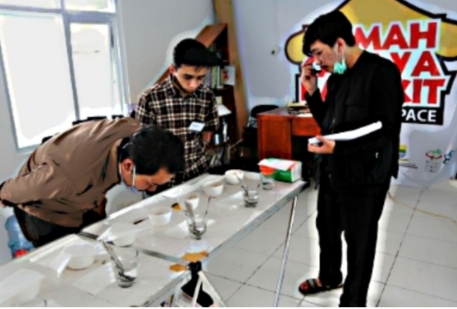 Peserta diajari cupping atau uji cita rasa dengan mencoba mencicipi berbagai jenis kopi supaya mereka mengetahui karakteristiknya.