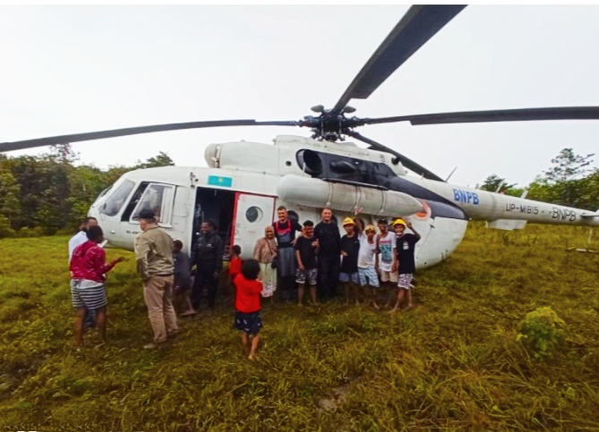 Namun, akibat cuaca buruk, helikopter yang membawa 14 kru dan staf perusahaan ini akhirnya mendarat di Distrik Nimbokrang.