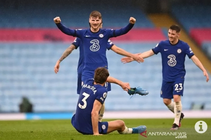 Sempat tertinggal akibat gol Raheem Sterling, Chelsea bangkit membalas melalui Hakim Ziyech sebelum Marcos Alonso mencetak gol dramatis mengunci kemenangan pada injury time, demikian catatan laman resmi Liga Inggris.