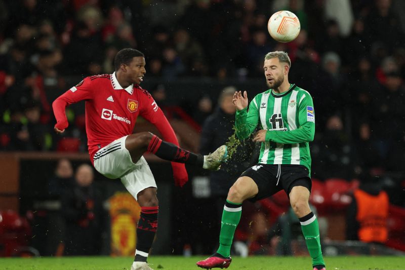 Pemain Manchester United Tyrell Malacia berebut bola dengan pemain Real Betis Aitor Ruibal dalam laga leg pertama babak 16 besar Liga Europa, di Stadion Old Trafford, Manchester, Inggris.(AFP)
