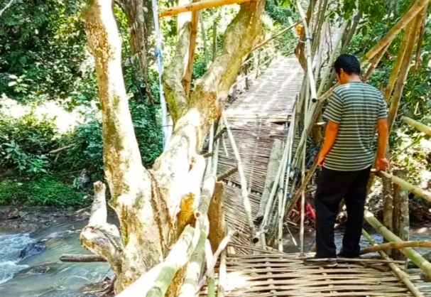 “Karena jembatan tersebut rusak akibat diguyur hujan, anak-anak santri yang akan mengaji ke Ponpes Tahfizd Quran Almapus harus bergelantungan, bahkan ada juga yang harus memutar dengan jarak yang lebih jauh lagi,” katanya.
