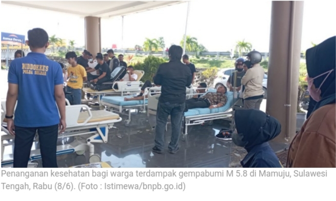 Gempa berkekuatan M 5,8 di wilayah Sulawesi Barat pada Rabu (8/6) siang, pukul 12.32 WIB itu berpusat di laut dengan kedalaman 10 kilometer tepatnya 43 km sebelah barat daya Kabupaten Mamuju.