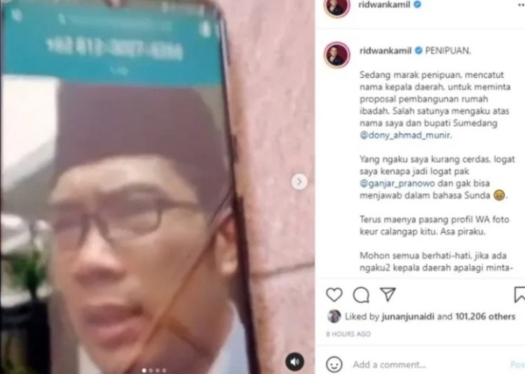 Ridwan Kamil mengimbau masyarakat berhati-hati jika mendapat pesan atau panggilan dari nomor yang mengaku sebagai kepala daerah.