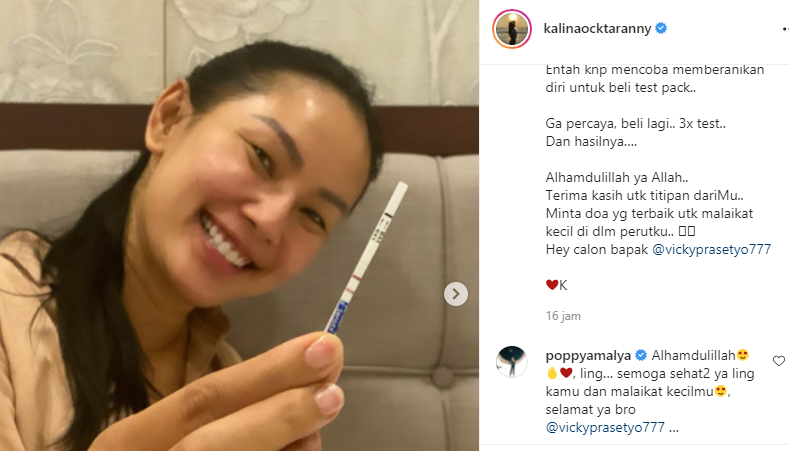 Kalina memamerkan hasil testpack yang dijalaninya di akun Instagram pribadinya. Ia mengatakan, awalnya merasa mual dan suasana hatinya tak karuan.