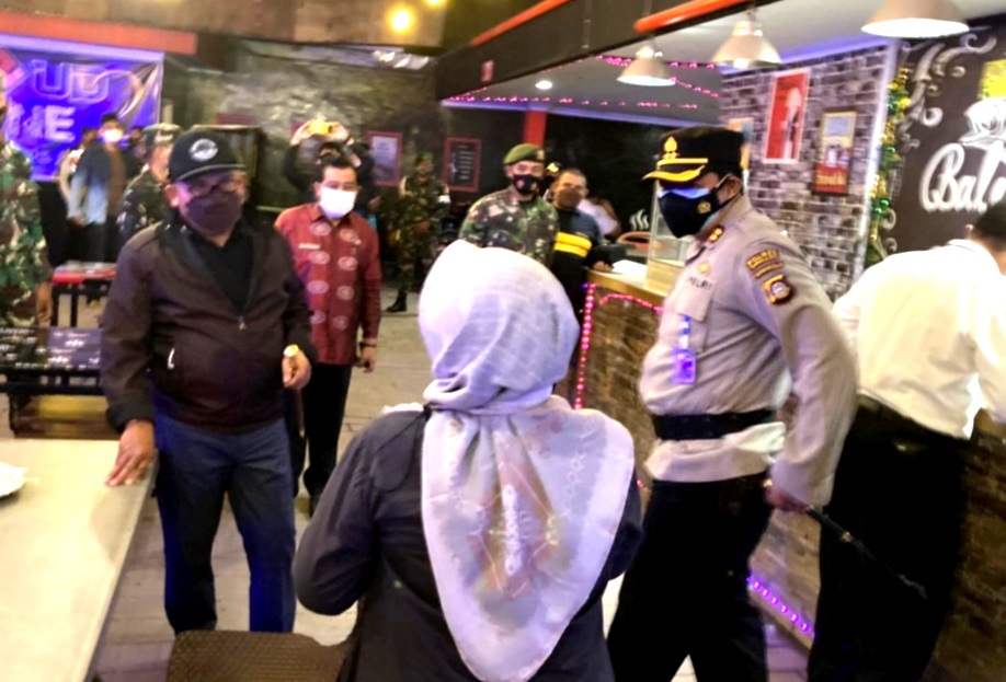 GORONTALO – Wali Kota Gorontalo Marten Taha bersama Kapolres, Dandim 1304/Gorontalo dan jajaran melakukan patroli di sejumlah titik keramaian, kafe dan restoran di Kota Gorontalo, Kamis (8/7/2021) malam.