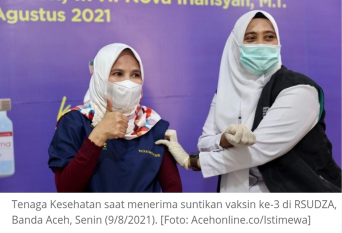 BANDA ACEH–Tenaga Kesehatan di Aceh mulai menerima penyuntikan vaksin Covid-19 dosis ketiga oleh Satuan Tugas (Satgas) Penanganan Covid-19 Aceh.