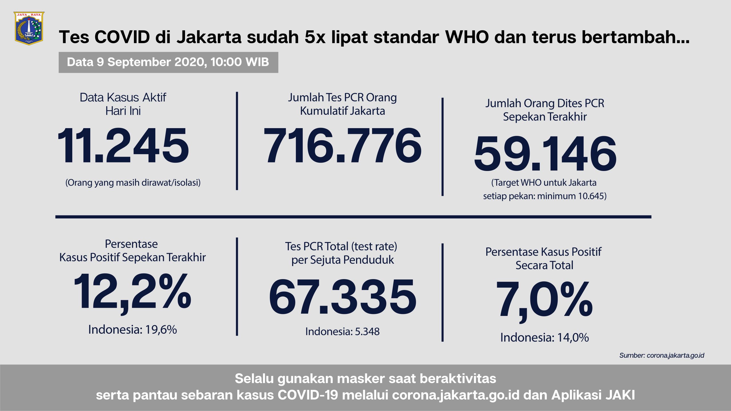 Dinas Kesehatan DKI Jakarta menyatakan sampai dengan 8 September 2020, sudah ada 801.307 sampel (sebelumnya 791.403 sampel) yang telah diperiksa dengan tes Polymerase Chain Reaction (PCR) untuk mengetahui jejak Covid-19 di lima wilayah DKI Jakarta lewat 54 laboratorium.