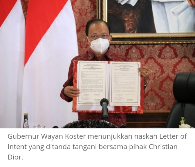 Gubernur Bali Wayan Koster bersama Marie Champey selaku Senior Vice President General Counsel mewakili Christian Dior Coutere S.A menandatangani letter of intent (pernyataan kehendak) tentang hal itu, Jumat (8/1/2021).