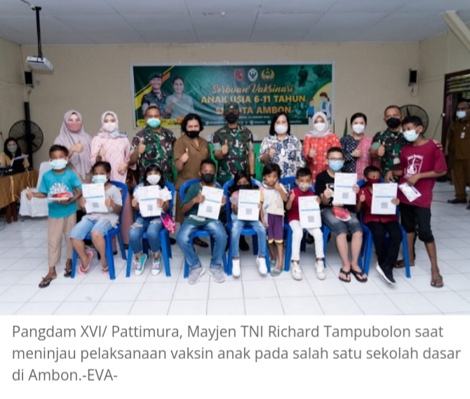 Pangdam XVI/ Pattimura, Mayjen TNI Richard Tampubolon, terjun langsung mengecek pelaksanaan vaksinasi Covid-19 untuk anak usia 6 – 11 tahun, Selasa (11/01/2022), bertempat di SD Xaverius dan SD Kartika Ambon.
