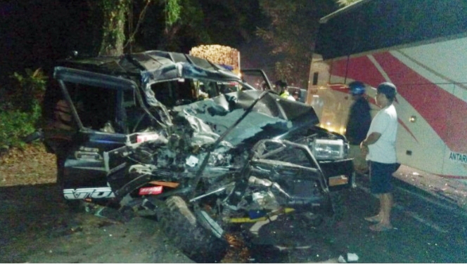 Sementara itu, pada saat bersamaan, dari arah berlawanan (Bulu) datang bus yang dikemudikan Zaenal Arifin. Sopir bus kaget saat tiba-tiba melihat mobil melaju terlalu ke kanan. Karena jarak sudah dekat, sopir tidak dapat menghindar sehingga terjadi kecelakaan maut itu. Kedua korban pun tewas dan dua lainya luka.