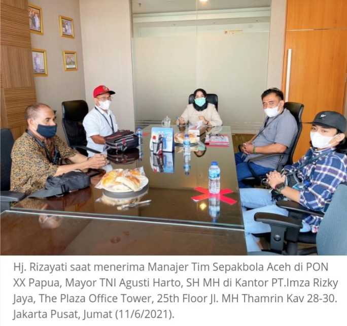 Hal ini disampaikan Hj Rizayati saat menerima Manajer Tim Sepakbola Aceh di PON XX Papua, Mayor TNI Agusti Harto, SH MH di Kantor PT.Imza Rizky Jaya, The Plaza Office Tower, 25th Floor Jl. MH Thamrin Kav 28-30. Jakarta Pusat, Jumat (11/6/2021).