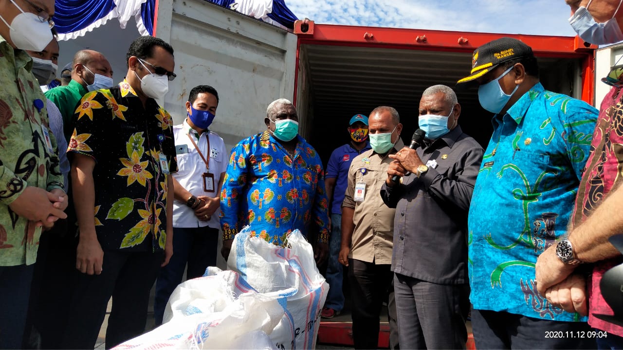 MANOKWARI- Gubernur Papua Barat Dominggus Mandacan melepas secara simbolis pengapalan akhir tahun biji kakao kering produksi Koperasi Eibert Suth Ransiki, Manokwari Selatan, di Pelabuhan Manokwari, Kamis (12/11/2020).