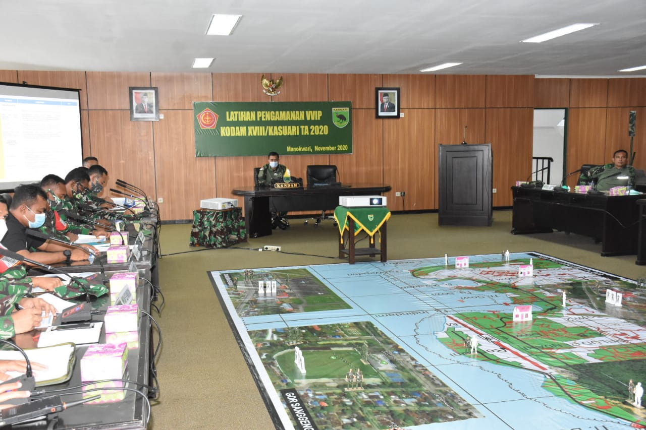 MANOKWARI – Tactical Floor Game (TFG) dalam pelaksanaan Latihan Pengamanan VVIP Kodam XVIII/Kasuari Tahun 2020, Rabu (11/11/2020)), digelar di Ruang Yudha Makodam XVIII/Kasuari, Trikora Arfai 1, Manokwari dipimpin Kasdam XVIII/Kasuari Brigjen TNI Ferry Zein.
