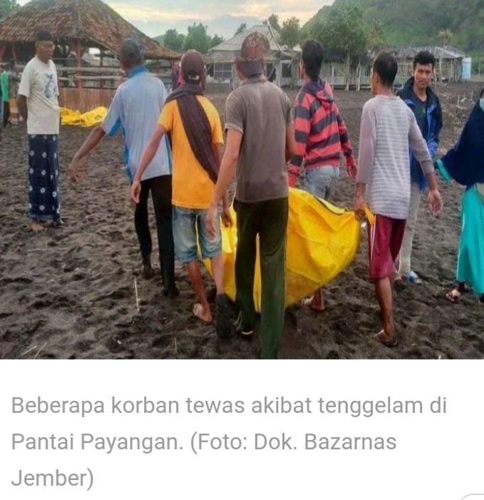JEMBER–Sebanyak 11 orang anggota padepokan di kota Jember tewas terseret ombak Pantai Payangan. Kabid Humas Polda Jatim Kombes Pol Gatot R Handoko mengatakan berdasarkan keterangan yang digali dari korban selamat, ritual yang diadakan di pantai yang terletak di Dusun Watu Ulo, Desa Sumberejo, Kecamatan Ambulu, Jember tersebut awalnya diikuti 24 orang.