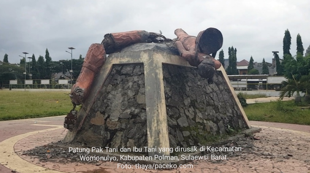 Berdasarkan pantauan wartawan, patung ibu tani membawa bakul, yang awalnya berdiri kokoh di depan alun-alun Kecamatan Wonomulyo, itu kini tumbang dengan sejumlah kerusakan.