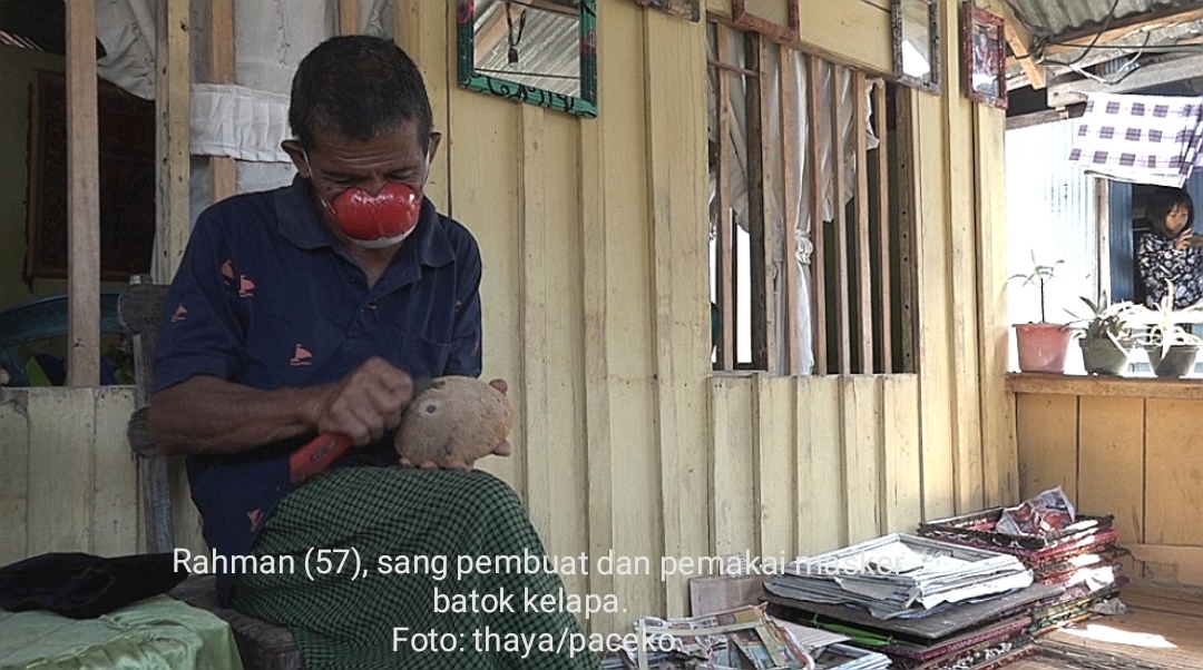 “Karena waktu itu susah mendapatkan masker, akhirnya saya berinisiatif membuat sendiri. Saya cari gergaji, cari tempurung (batok) kelapa, kemudian saya bentuk menyerupai masker,“ ujar Rahman, sembari mencontohkan cara membuat masker yang dipakainya.