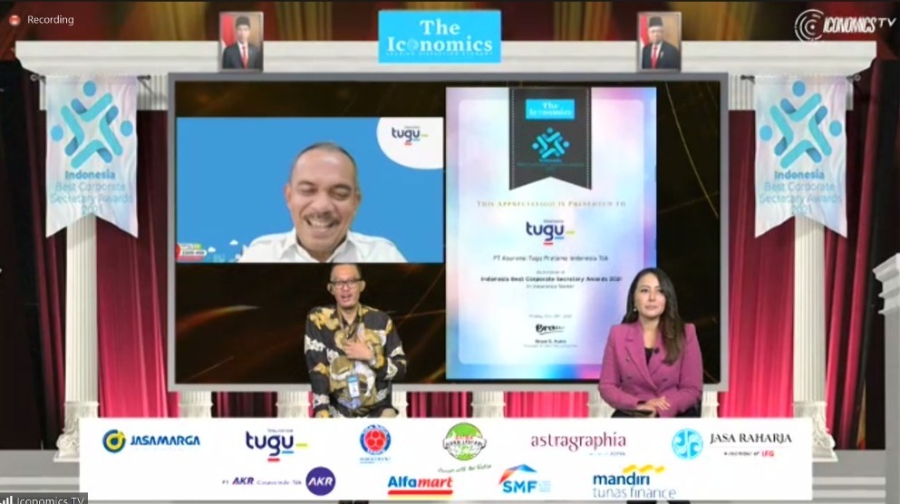 Rudi Donardi, Corporate Secretary Tugu Insurance menerima penghargaan secara virtual yang diberikan Bram S Putro selaku Founder & CEO The Iconomics.
