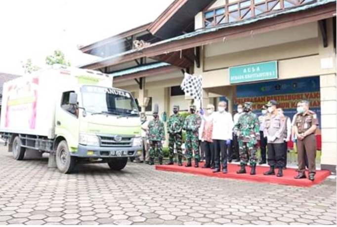 Di Kalbar, pendistribusian vaksin Covid-19 Sinovac dilepas oleh Gubernur Kalbar H Sutarmidji, SH, MHum bersama Forkorpimda Kalbar di halaman Dinas Kesehatan Provinsi Kalbar, Rabu (13/1) pagi.