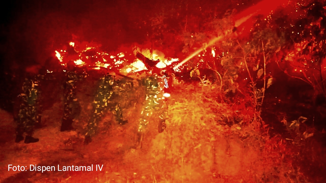 JAKARTA – Tentara Nasional Indonesia (TNI) Angkatan Laut mengerahkan prajurit Pangkalan TNI AL Tanjung Balai Karimun untuk membantu memadamkan kebakaran hutan dan lahan di Kelurahan Teluk Uma samping Komplek Griya Praja Kecamatan Tebing Karimun, Kepulauan Riau, Kamis (11/3/2021).