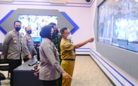 METRO – Wakil Walikota Metro Qomaru Zaman dan Kapolres Metro Retno Prihawati mengikuti peluncuran Aplikasi SIM Nasional Presisi (SINAR) secara virtual, di Aula Polres setempat, Selasa (13/04/2021)
