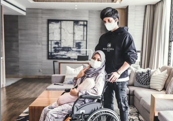 Atta foto Aurel sedang duduk di kursi roda di akun Instagram miliknya sembari mengabarkan keadaan istrinya sedang kurang baik.