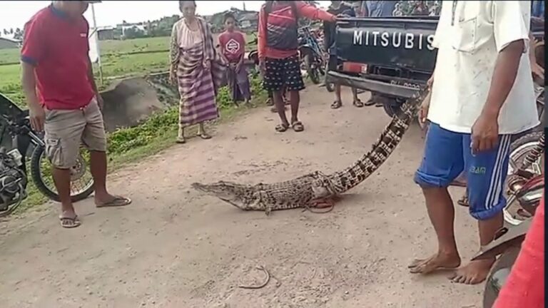 “Tadi ditangkap pakai kayu dan tali, kita jerat, cukup lama baru bisa ditangkap (buaya). Karena melawan dan selalu menenggelamkan diri,” ungkapnya.