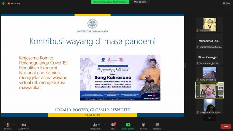 “(Wayang berperan) mengomunikasikan budaya (kebiasaan) baru, mencuci tangan, memakai masker, dan lain sebagainya. Masalah pandemi itu begini, (jadi) kita harus begini,” tutur Kasidi dalam webinar ‘Peran Wayang Sebagai Media Komunikasi Menghadapi Pandemi’ yang diselenggarakan oleh Fakultas Filsafat UGM, dalam rangka memperingati Dies Natalis Fakultas Filsafat ke-54, pada Sabtu 14 Agustus 2021.
