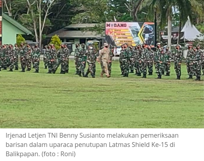 BALIKPAPAN–Irjenad Letjen TNI Benny Susianto memimpin Upacara Penutupan Latihan Bersama (Latma) Garuda Shield Ke-15 yang digelar di Amborawang di Lapangan Markas Yonif Raider 600/Modang, Balikpapan, Sabtu (14/8/2021) Pukul 08:00 Wita.