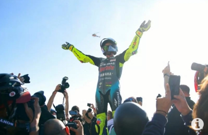 Rossi menghentikan motornya di salah satu tikungan setelah finis P10 dan langsung diserbu oleh para marshal, para pebalap, dan juga para fan yang menyalaminya di akhir karier sang pebalap.