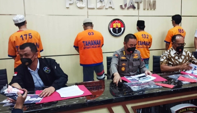 Dalam jumpa pers di Mapolda Jawa Timur, Minggu (13/12/20202) polisi menyatakan telah menangkap dan menahan empat orang yang mengancam akan menggorok leher Mahfud MD.