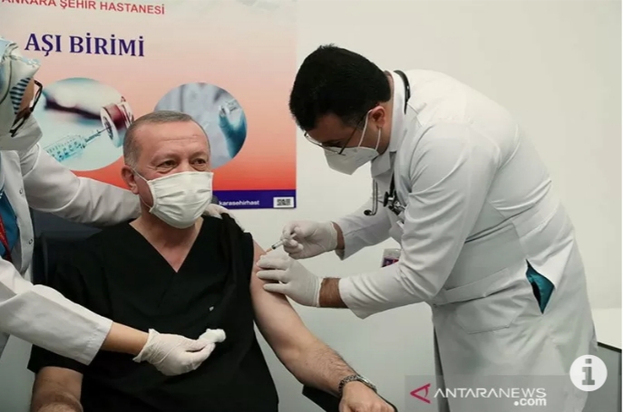 Erdogan menerima dosis vaksin pertamanya di Rumah Sakit Kota Ankara. Dia tiba bersama Menteri Kesehatan Fahrettin Koca, yang menerima vaksin pertama di negara itu sehari sebelumnya.