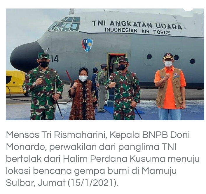 “Mendengar kabar terjadinya gempa di Mamuju Sulbar, Presiden memerintahkan Doni Monardo dan Mensos Risma berangkat ke Mamuju dan segera merubah rencana, berangkat ke Mamuju Sulawesi Barat,” kata Tenaga Ahli BNPB Egy Massadiah, Jumat (15/1/2021).