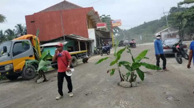 LEBAK–Dengan menanam pohon pisang di jalan dan melarang kendaran perusahaan untuk masuk, sejumlah warga melakukan aksi penutupan ruas Jalan Raya Cibayawak-Sawarna. Aksi warga tersebut mengikuti protokol kesehatan.