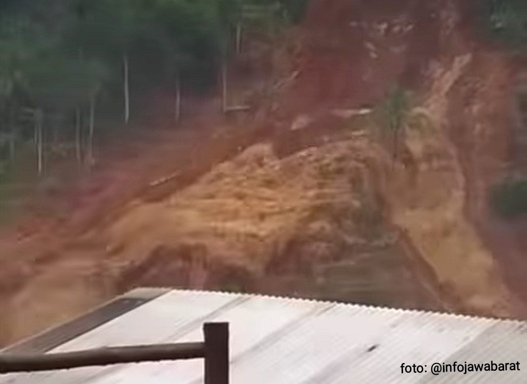 Dari video yang diposting akun Infojawabarat, tampak tanah longsor menerjang area persawahan di tengah rintikan air hujan.