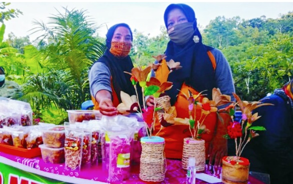 Kelomok beranggotakan 35 orang ini dilatih berkreasi dengan memanfaatkan bahan dari lingkungan sekitar. “Kami diminta membuat makanan olahan dan kerajinan,” kata Sri.