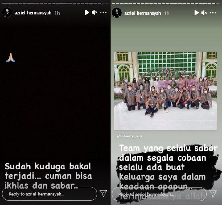 “Sudah kuduga bakal terjadi. Cuman bisa ikhlas dan sabar,” tulis Azriel dengan latar belakang hitam dan emoji dua telapak tangan menempel.