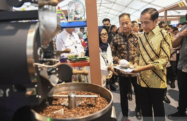 Presiden Joko Widodo meninjau produk dalam negeri yang dipamerkan pada Business Matching Produk Dalam Negeri 2023 di Istora Senayan, Jakarta, Rabu (15/3/2023). (Antara Foto/Hafidz Mubarak A/nym/pri)