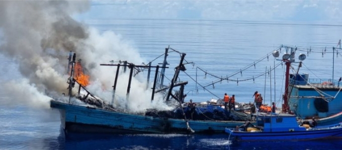 KRI STS-375 segera mendekat ke lokasi dan melaksanakan pemadaman dibantu oleh kapal nelayan lain yang kebetulan berada tidak jauh dari lokasi kejadian.