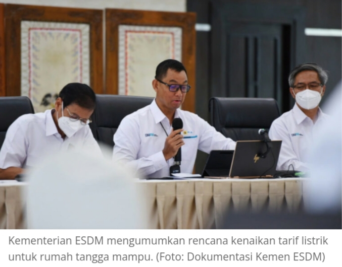 “Kita memerlukan tarif adjustment salah satunya dalam rangka untuk sharing burden dan kita sekaligus mengoreksi bantuan Pemerintah agar lebih tetap sasaran. Kita melakukan koreksi untuk lebih tepat sasaran dan lebih berkeadilan dan diputuskan akan diberlakukan kepada golongan pelanggan Rumah Tangga berdaya mulai 3.500 VA ke atas (R2 dan R3) dan golongan Pemerintah (P1, P2, dan P3),” ujar Direktur Jenderal Ketenagalistrikan Rida Mulyana, Senin (13/22).
