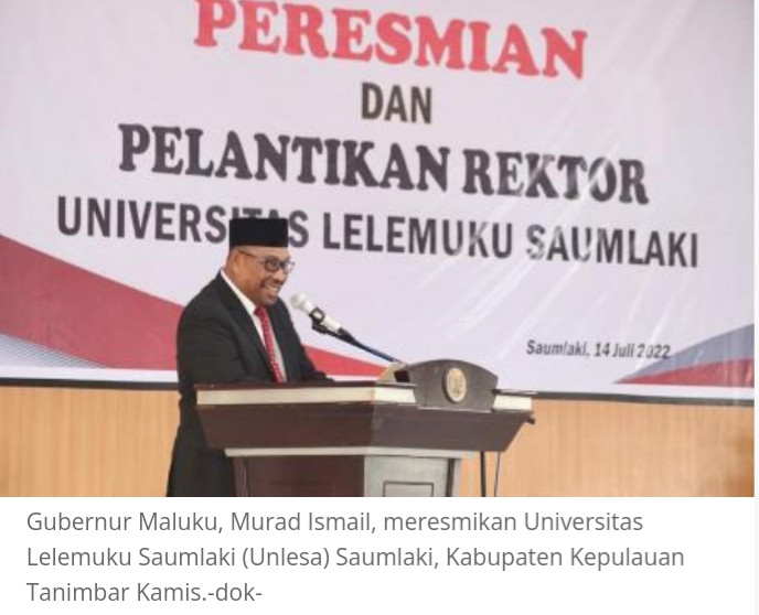 SAUMLAKI- Gubernur Maluku, Murad Ismail, Kamis (14/7/2022) meresmikan Universitas Lelemuku Saumlaki (Unlesa) yang dipusatkan di Gedung Kesenian Kota Saumlaki, Kabupaten Kepulauan Tanimbar (KKT). Peresmian ditandai dengan penekanan sirene dan penandatangan prasasti oleh Gubernur.