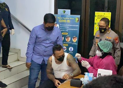Jerinx mendapatkan vaksin di Biddokkes Polda Metro Jaya.