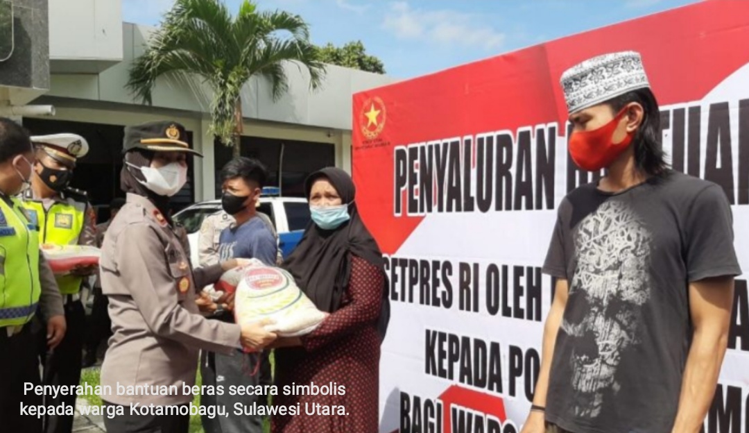 Penyerahan bantuan beras, dari Sekretariat Presiden (Setpres) Republik Indonesia, itu diserahkan Kapolres Kotamobagu, AKBP Prasetya Sejati SIK, yang diwakili Waka Polres Kompol Rina Frillya SIK.