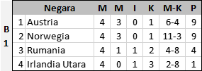 Kedua tim meraih kemenangan identik 1-0, Norwegia atas tamunya Irlandia Utara dan Austria di Rumania, untuk sama-sama mengumpulkan sembilan poin.