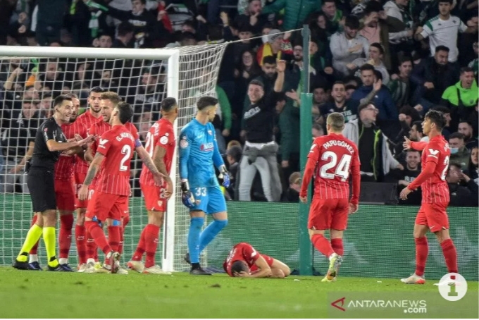JAKARTA–Laga derbi antara Real Betis dan Sevilla di Piala Raja Spanyol (Copa del Rey) terpaksa dihentikan setelah kepala pemain Sevilla Joan Jordan terkena benda yang dilempar dari tribun suporter tim tuan rumah.