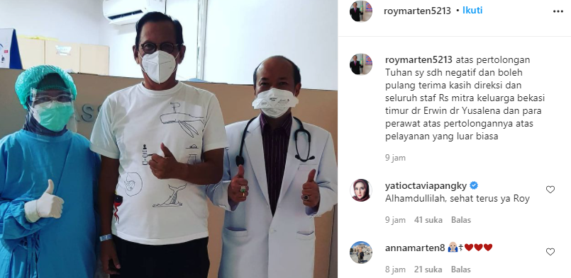 “Atas pertolongan Tuhan sy sdh negatif dan boleh pulang,” tulis Roy Marten. Kemudian, aktor berusia 68 tahun itu juga mengungkapkan rasa terima kasih kepada dokter dan juga para perawat.