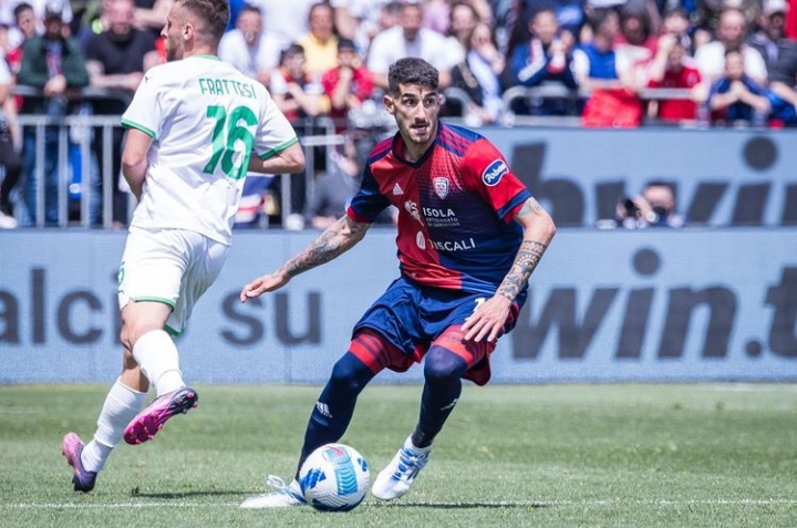 Alessandro Deiola membidik gol setelah lolos dari kawalan pemain Sassuolo. (Instagram @cagliari)