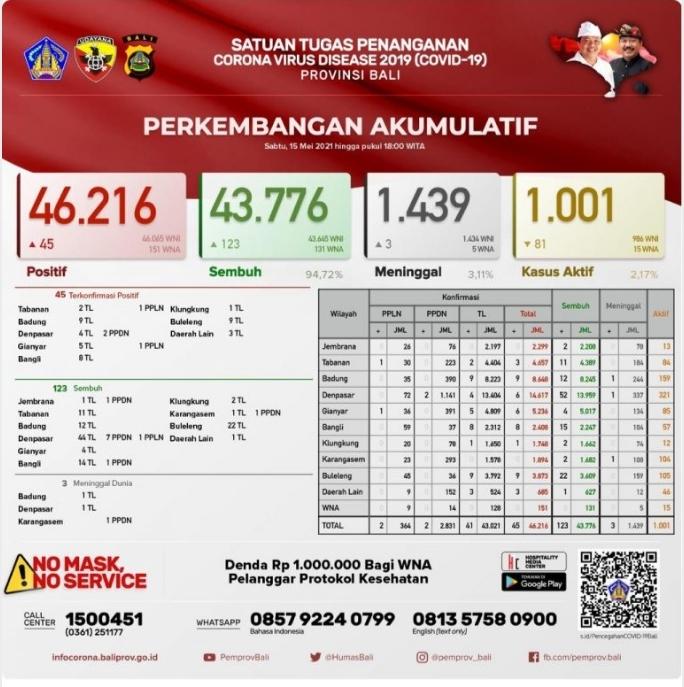 BALI – Jumlah kasus aktif Covid-19 di Bali pada hari Sabtu (15/5/2021) tercatat 1.001 orang (2,17%).