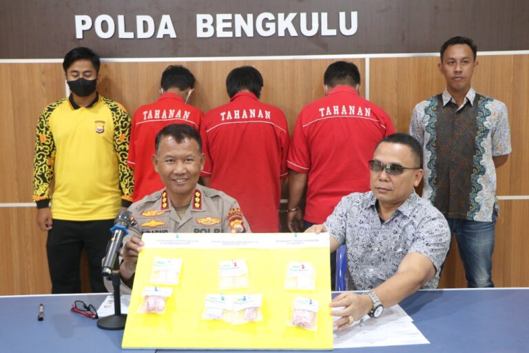 Kabid Humas Polda Bengkulu Kombes Pol Sudarno, S Sos, MH, didampingi Kasubdit 3 Kompol M Simaremare saat konferensi pers yang digelar di Aula Ditresnarkoba, Jumat (15/7/22) mengungkapkan, pada Jumat, 8 Juli 2022 pihaknya berhasil menangkap tiga orang terduga pelaku pengedar Narkoba jenis sabu-sabu.