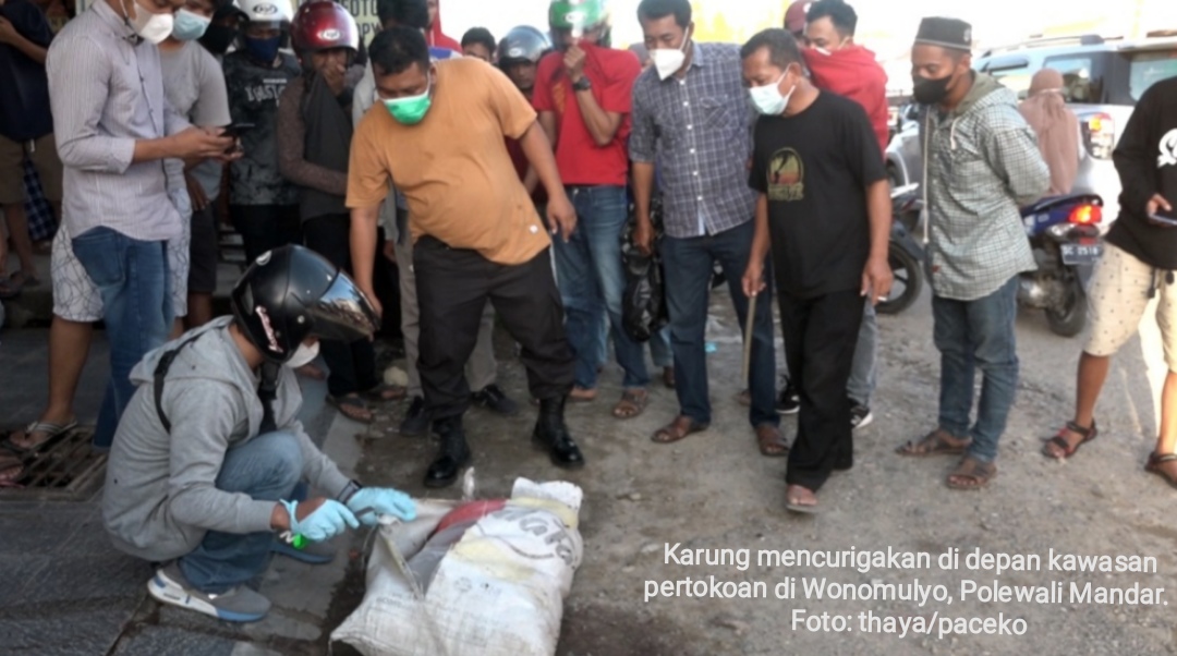 Penemuan karung mencurigakan ini terjadi di jalan trans Sulawesi, depan kawasan pertokoan di Kelurahan Sidodadi, Kecamatan Wonomulyo, Sabtu sore.